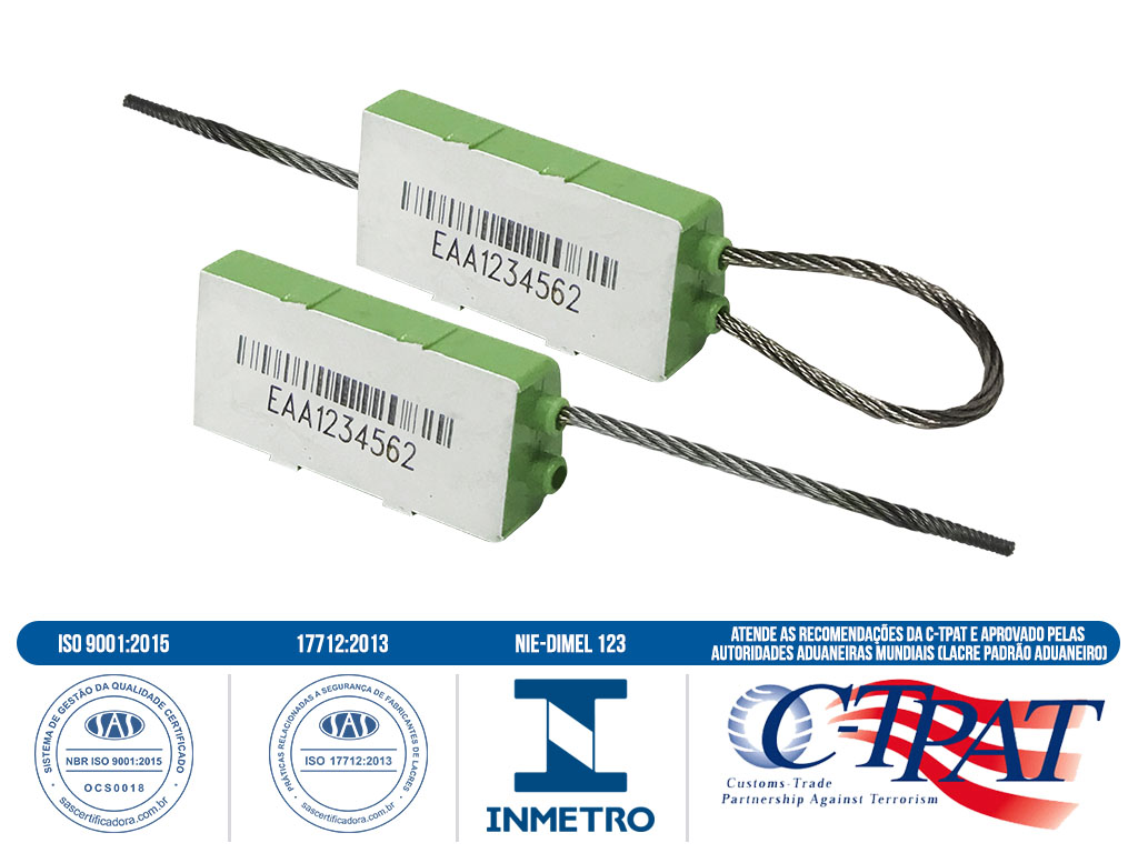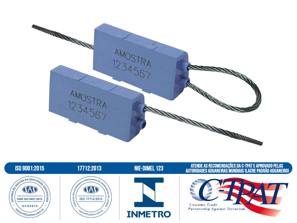 Lacre metálico em conformidade com a ISO 17712:2013, corpo em policarbonato, mecanismo de travamento metálico, blindado independente, com cabo de lacração em aço inox ou galvanizado 7 fios, com diâmetro de 1,50 mm e comprimentos variados conforme necessidade. Resistência a tração mínima de 227 daN.